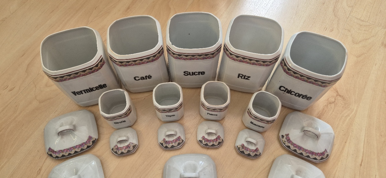 Wunderschöne antike Dosen für Gewürze, Kräuter oder auch Lebensmittel. Aus Porzellan. 2 Stk haben leichte Gebrauchsspuren an der Kante. Mit Deckel aber nicht sichtbar.